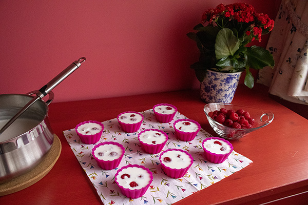 Пригответе формички (най-добре силиконови, защото от тях може да се изсипе в десертна чиния) и разсипете сместа. Ако ползвате пресни или замразени малини, пуснете по 3 – 4 във всяка формичка и след това пренесете панакотата в хладилника. Обикновено до час – два е стегнала и е готова за опитване. Ако ползвате сладко, може да я гарнирате при сервиране.