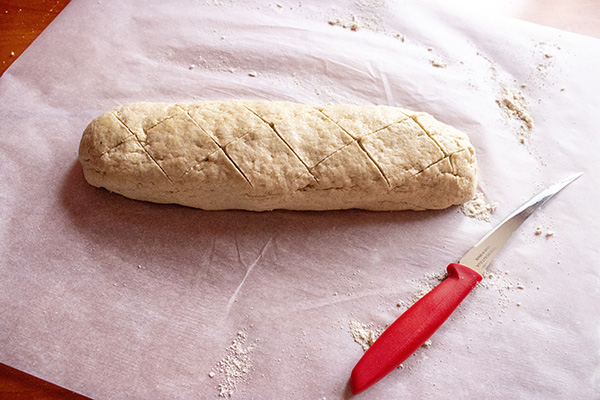 Не се иска много месене, просто да се усвои брашното. Аз обикновено пренасям сместа върху хартия за печене, преди да започна месенето. Сместа ще е пореста и леко безформена. Когато се усвои брашното, оформете продълговата багета. Може да направите декоративни нарези или да посипете с цели овесени ядки (в този случай топнете сладкарска четка във вода и леко намокрете повърхността преди да посипете ядките).