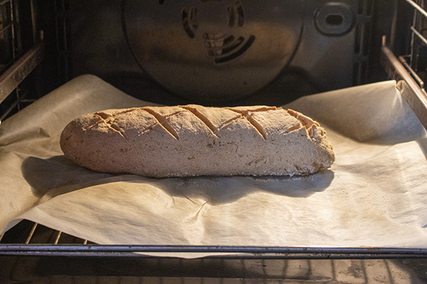 Така, както е с хартията отдолу, пренесете багетата върху голямата плитка тава или решетката на фурната и печете около 60 – 70 минути на 190 градуса. Оставете да изстине напълно преди разрязване.