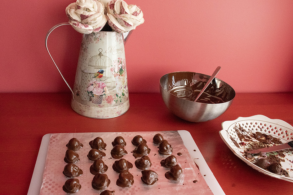 Също така никога не бях правила бонбони с пресни плодове – само със сушени. Разликата е съществена, защото горещият разтопен шоколад може да промени необратимо вкуса на плодовете. Затова ми трябваше време да се реша.