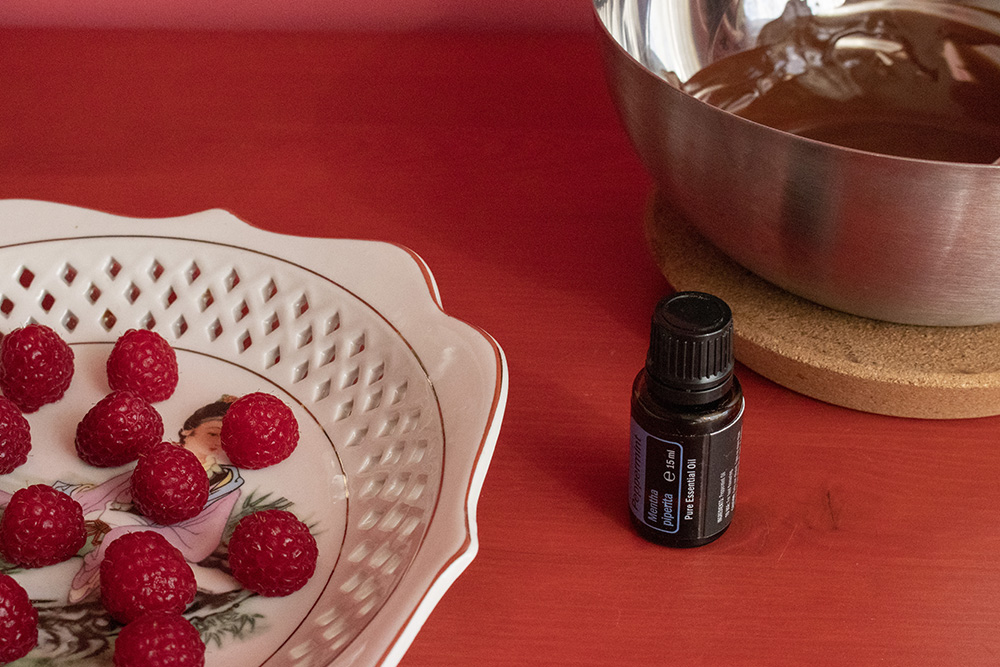 Шоколадът се разтапя на водна баня с кокосовото масло. Когато се получи гладка смес, се сваля от котлона. След като поизситне се добавя маслото от мента и се разбърква. Не изчаквайте прекалено много, защото трябва да е наистина течен. Не изхвърляйте топлата вода.