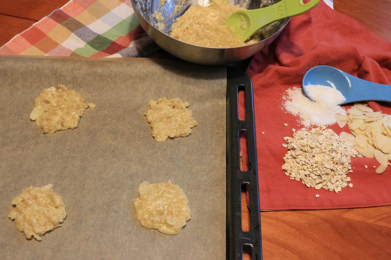 От приготвената смес излизат 18 бисквити с готов размер 8 – 9 см в диаметър. Ако фурната ви е със станартен размер, във всяка тава сложете по 9 бисквити, с големи разстояния помежду им. За всяка бисквита отмерете между половин и една супена лъжица от сместа. Аз ги исках плоски, затова ги притиснах добре.