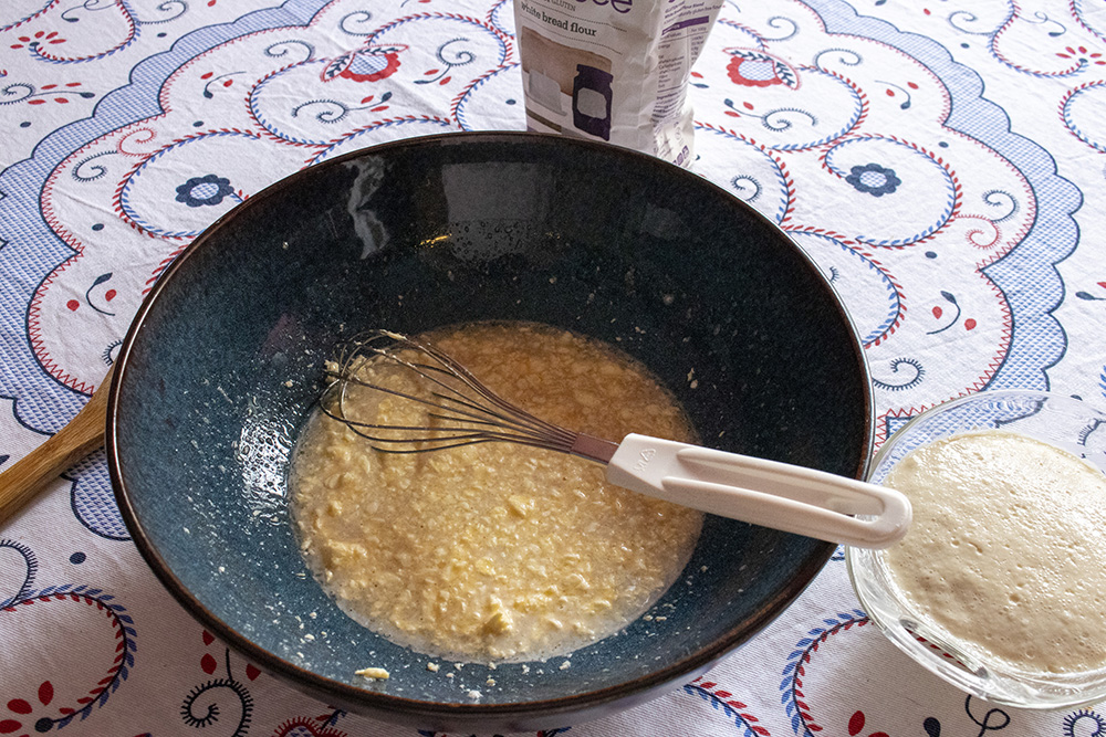 Продуктите за закваската се смесват в малък съд и се разбъркват добре. Съдът се оставя на топло място, за около 20 мин, за да шупне (може да отнеме повече, или по-малко, зависи от околната температура).