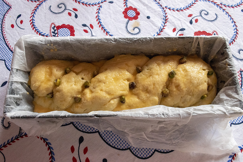 Нанесете плънката, завийте на руло и усучете, за да получите един дълъг фитил. Сгънете в средата и увийте двете дължини една около друга. Пренесете в предварително намаслена продълговата форма (аз го пренесох заедно с хартията за печене, върху която усуках фитила). Оставете на топло да втаса втори път, около час. Този път почти нямаше промяна в обема.