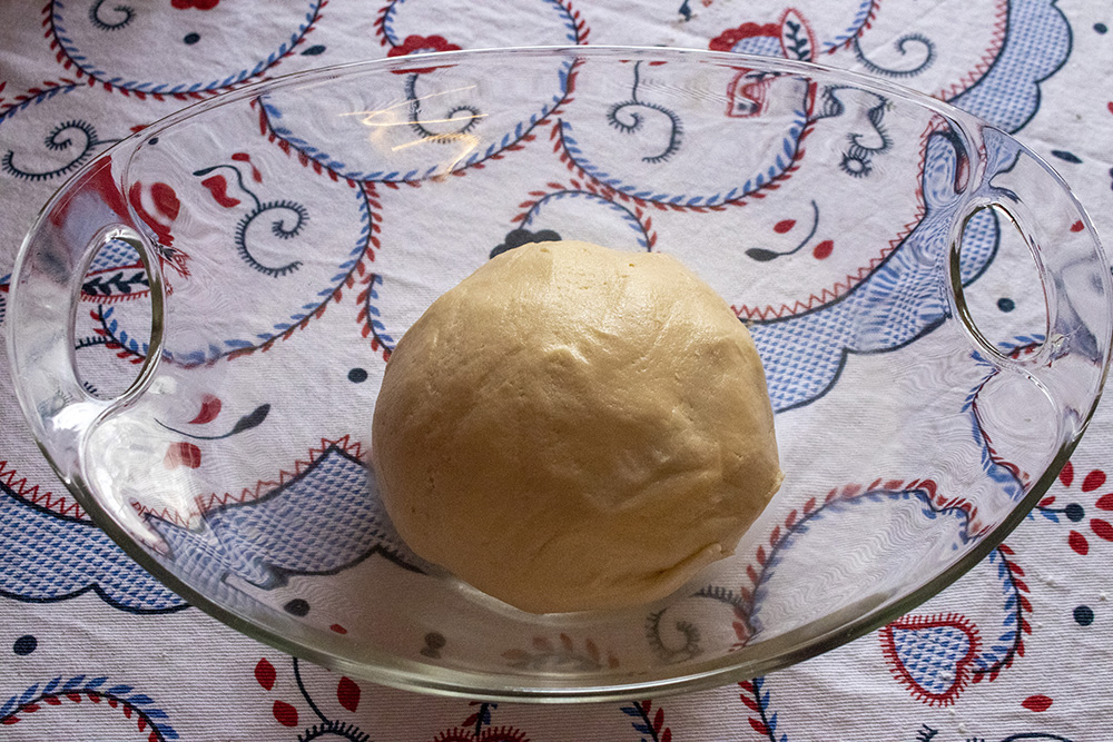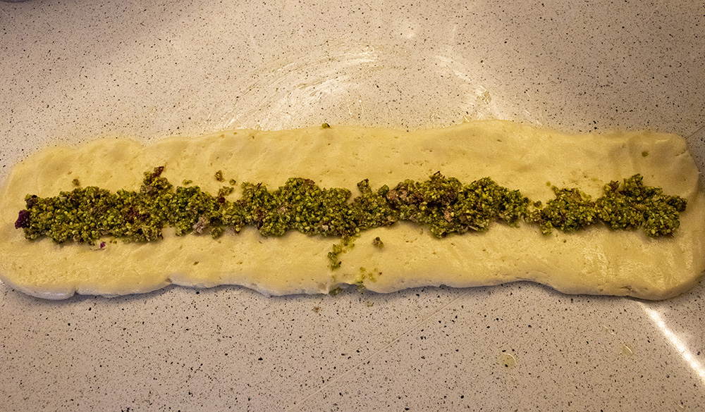Тестото се премесва с останолото разтопено и леко топло масло и след това се разточва с длани до правоъгълник, на който едната страна е много по-тясна.