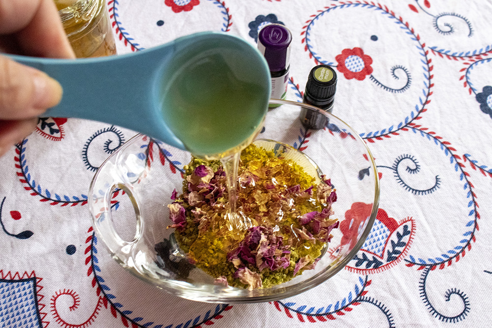 За плънката, смелете шам фъстъка и разбъркайте с розовите листа, меда, есенцията и маслото от кардамон. Оставете настрана, покрито.