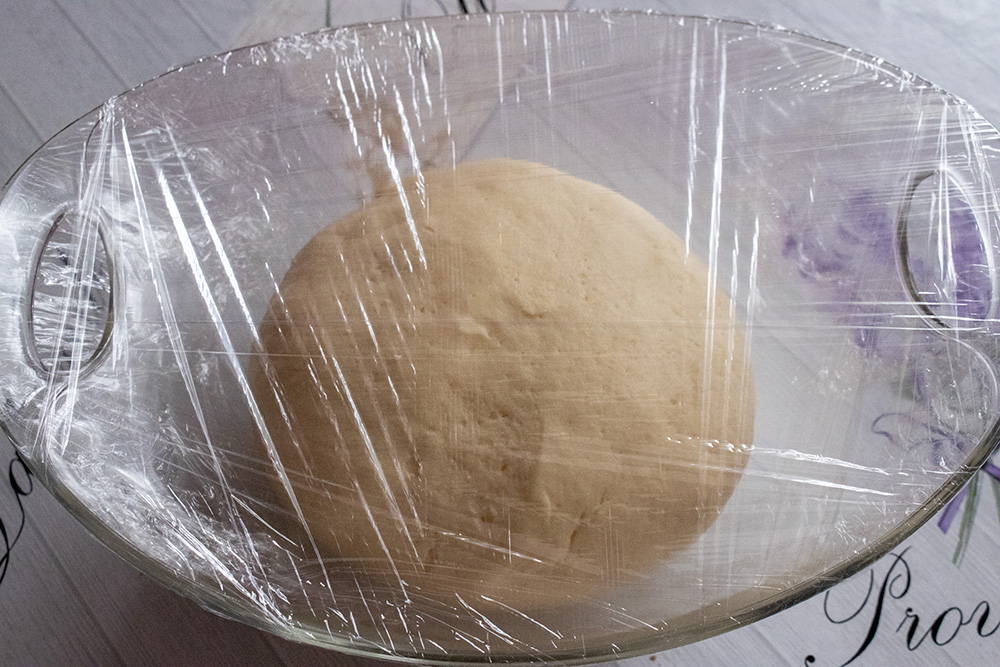 Оформете на топка, сложете в затоплен съд и покрийте с фолио и кърпа. Сложете на стайна температура, за да втаса – около 2 – 3 часа.