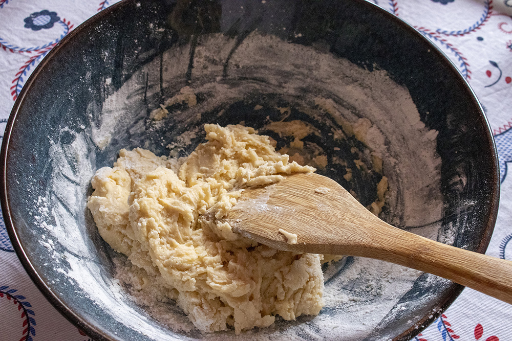 Две чаши от брашното се пресяват и се добавят на части към яйчената смес. Разбърква се с дървената лъжица и се замесва меко тесто. Ако е лепкаво, се добавя още малко брашно. Измесва се около 10 – 15 минути. Тестото ще залепва за плота, но ще се отделя лесно и ще запазва формата си, без да се „разлива“.