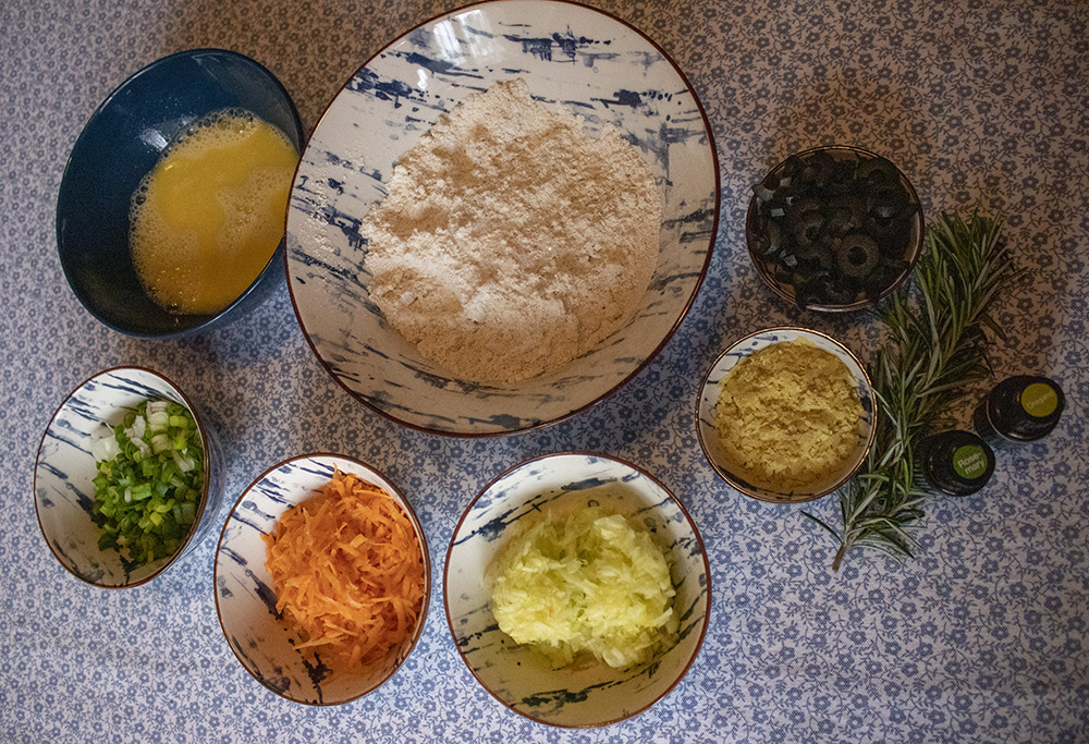 Разбийте яйцето и добавете млякото, зехтина, солта, маята и маслата от риган и розмарин. Пресейте брашното и добавете постепенно към яйчената смес, заедно с бакпулвера. Сместа е доста гъста. Последно добавете зеленчуците и разбъркайте добре.