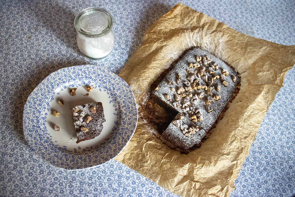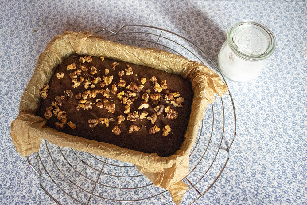 Изсипете готовата смес в намазнена или покрита с хартия за печене тавичка с размер 15 х 22 см и печете на 180 градуса около 30 минути. Към двадесетата минута отворете и посипете предварително запечените орехи върху браунито. Имайте предвид, че орехите няма да потънат в тестото. Ако предпочитате да са вътре в браунито, може да ги смесите с тестото преди печене. Аз не го направих, защото, дори предварително запечени, ядките се овлажняват – въпрос на вкус.