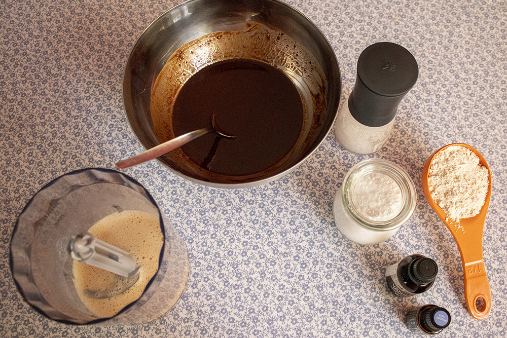На водна баня разстопете шоколада и маслото и разбъркайте добре до пълно хомогенизиране. Добавете еритритола, разбитите яйца, солта, ванилията и ментата. Постепенно добавете с бъркане брашното.