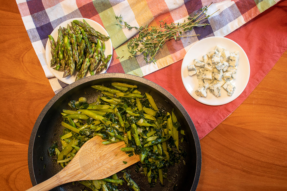 В тиган на средна степен на котлона загрейте маслото и задушете леврудата и лука с малко сол и черен пипер – около 3 минути. Добавете нарязаните аспержи (без връхчетата) и задушете под капак като разбърквате от време на време, за около 8 – 10 минути. Добавете мащерката и разбъркайте. Свалете от котлона и добавете горгонзолата. Разбъркайте.