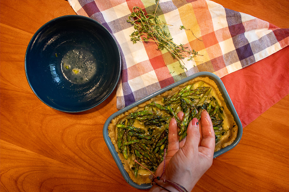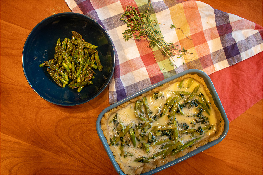 Загрейте фурната на 200 градуса. Изсипете пълнежа върху блата. Разбийте яйцата с тел и изсипете върху пълнежа. Последно подредете отгоре връхчетата на аспержите, предварително поляти с малко зехтин. Те са много по-крехки от стеблата и затова не се здушават. Освен това, подредени най-отгоре, придават много приятен вид на киша.