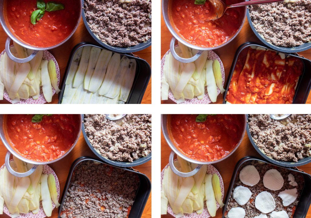 - Повторете 2 пъти стъпките от 1 до 4. Може да сложите и няколко листенца босилек върху доматения сос. След третия пласт месото ще свърши и ще ви останат само тиквички, доматен сос и моцарела.
