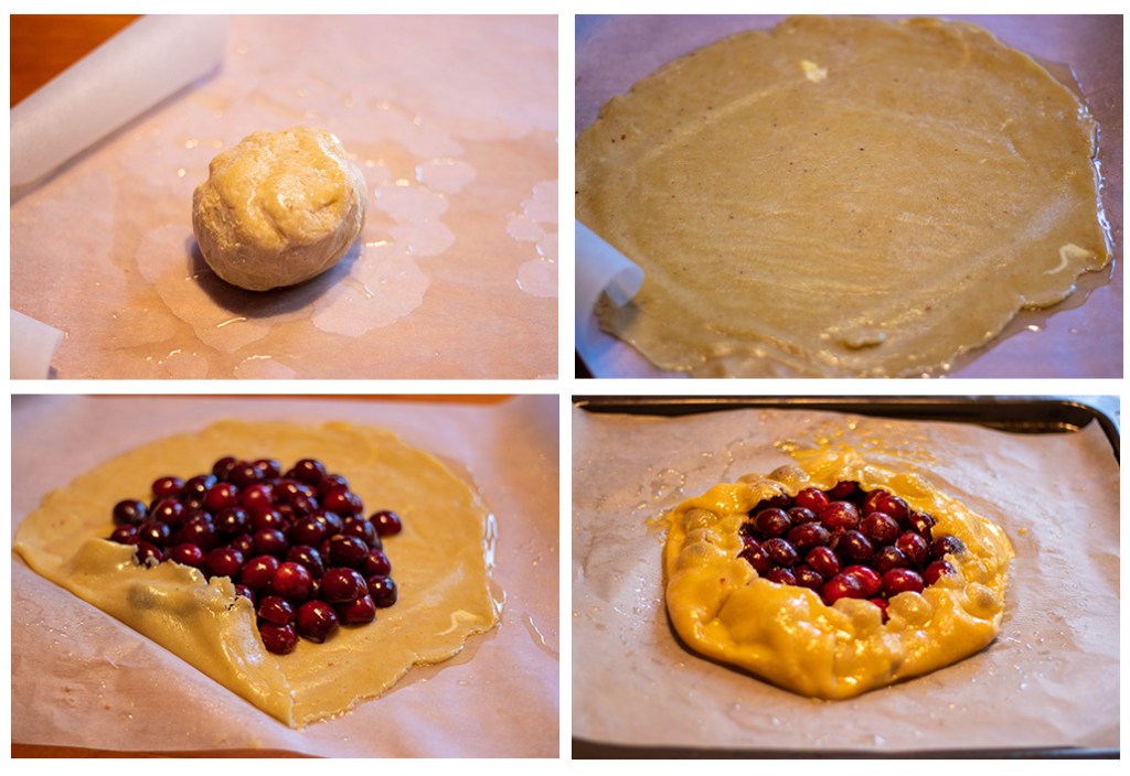 Когато приключите, завийте краищата на кората, като си помагате с листа хартия за печене. Нагънете на места и не се притеснявайте ако кръгът е неравномерен. Изсипете останалата течност върху черешите. Получи се галет с диаметър 24 см.