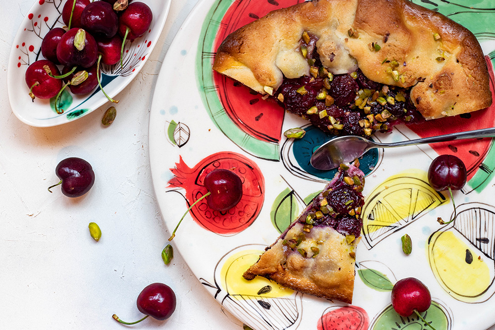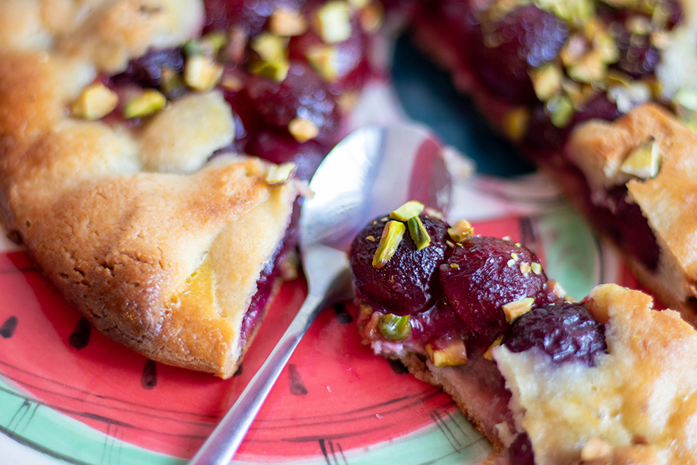 Писах вече, колко обичам череши. Основната част от закупените количества се изяждат преди дори да се замисля за някакъв десерт, но обикновено успявам да отделя малко и за готвене. Днешното предложение е много подобно на пай. Всъщност разликата е основно във формата. Пайът се прави в тавичка (кръгла, квадратна, правоъгълна…) или просто ринг и понякога има горна кора. Галетът е някак по-неформален, рустикален на вид. Няма нужда от тава или ринг. Ако пълнежът е сочен и може да се разтече, краищата се завиват навътре, за да го задържат. Както при пая, може би най-популярния галет е с ябълки. Отново както при пая, галетът може да е и сладък, и солен. И тестото за пай и галет също може да е еднакво.