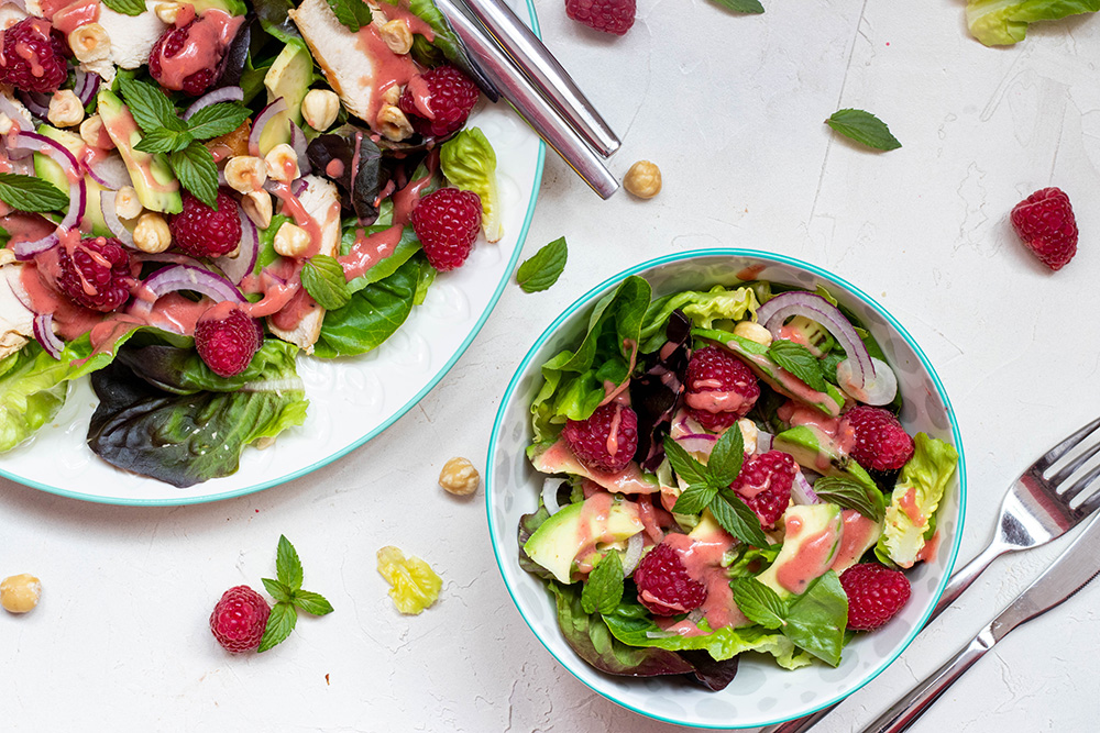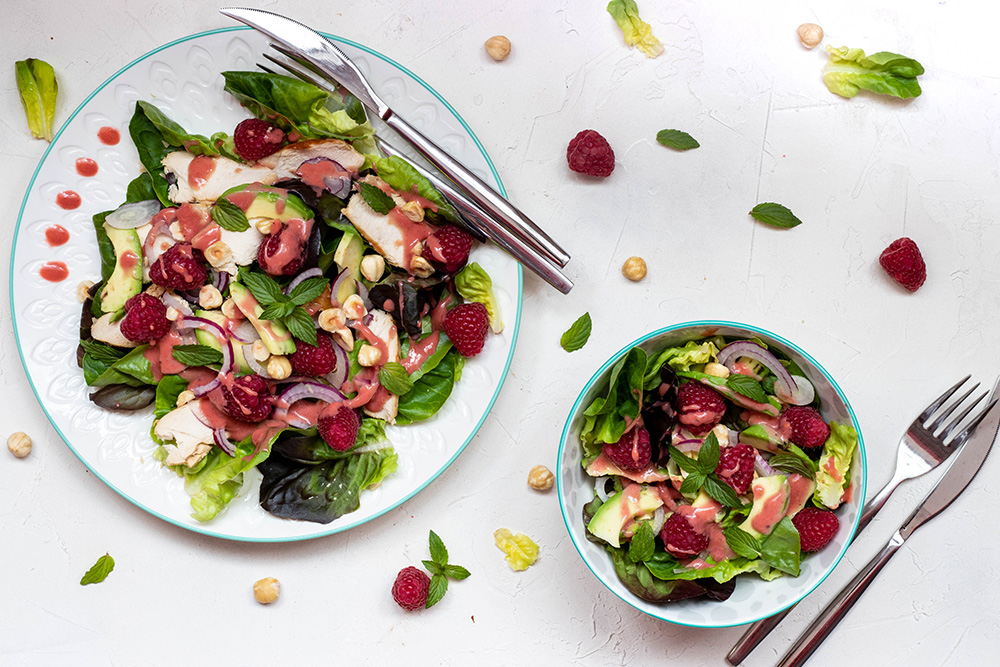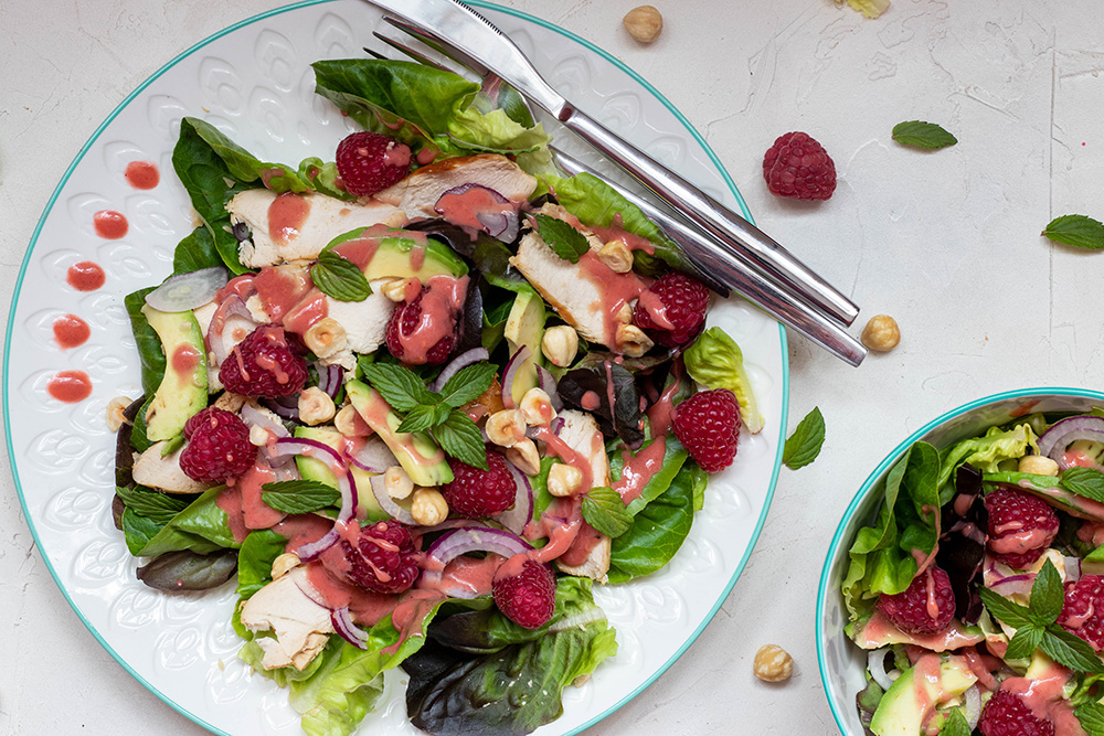 Измийте и подсушете салатата. Нарежете лука, авокадото и пилето на много тънки резени. В голяма купа смесете салатата, лука, пилето и авокадото. Подправете с винегрет и разбъркайте много внимателно, за да запазите резените авокадо цели. Пренесете в чиниите за сервиране и добавете лешниците, малините и ментата. Добавете още от винегрета и сервирайте.