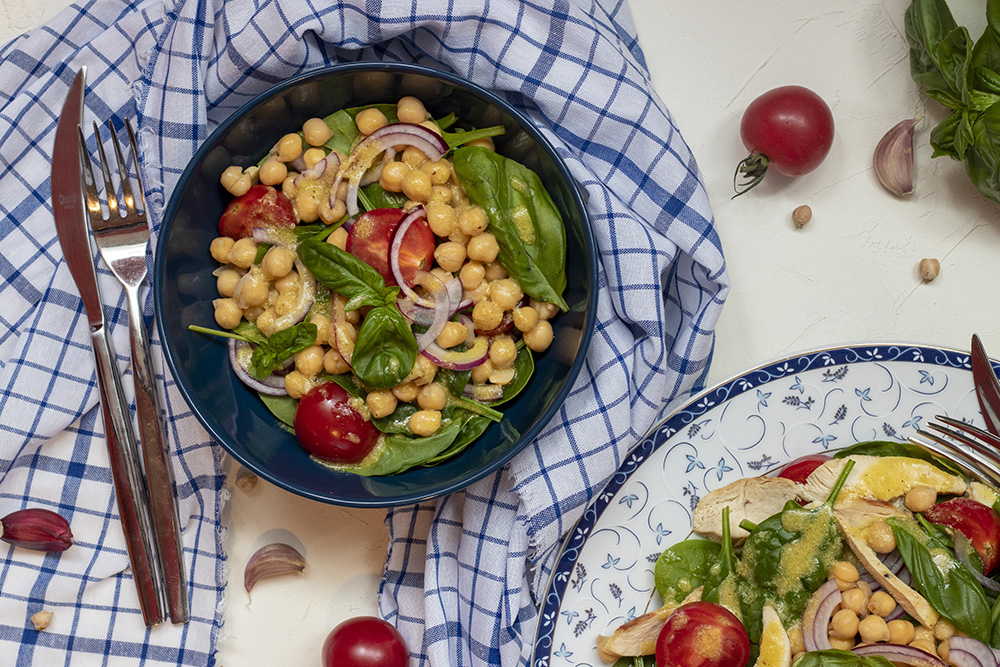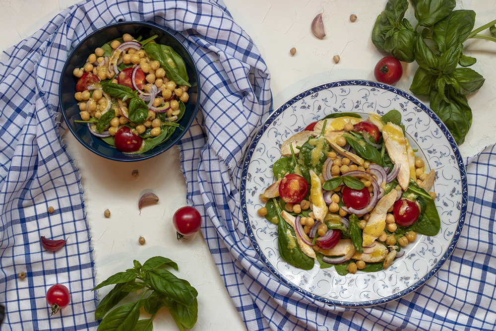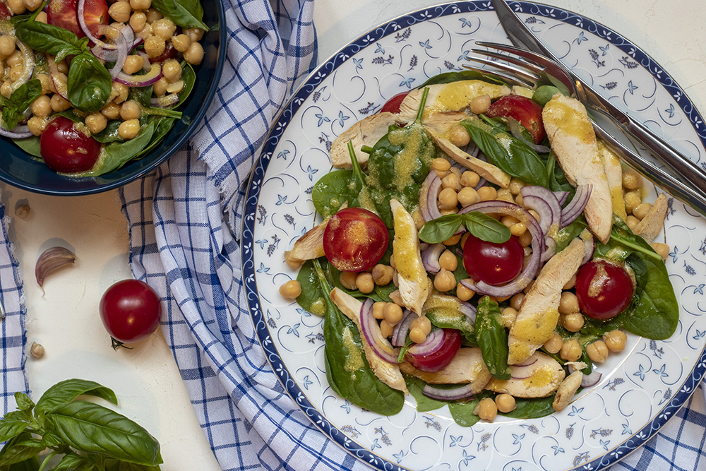 Измийте и подсушете спанака. Нарежете лука на тънки полумесеци и пилето на тънки резени. Срежете чери доматите на половина. В голяма купа смесете спанака, пилето, нахута, лука и доматите. Добавете дресинг и разбъркайте внимателно. Прехвърлете в чинии за сервиране, гарнирайте с няколко листа босилек и, ако е необходимо, добавете още дресинг.