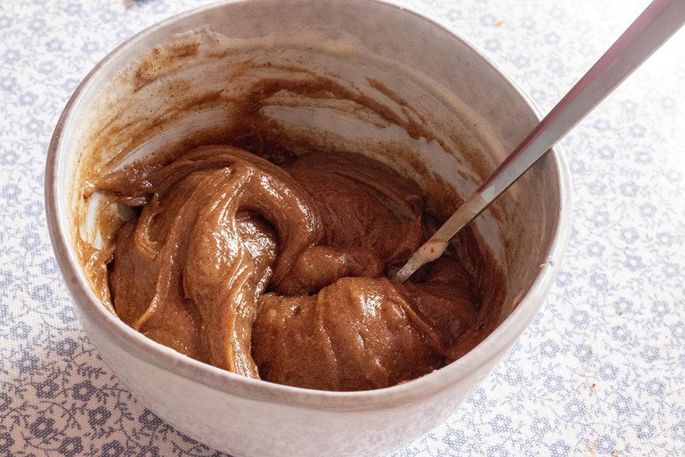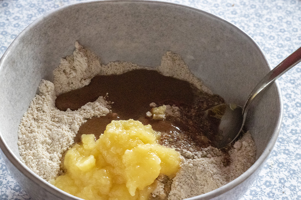 В достатъчно голяма купа смесете брашното, содата, шарлана, лешниковия тахан, ябълковото пюре и лененото „яйце“.