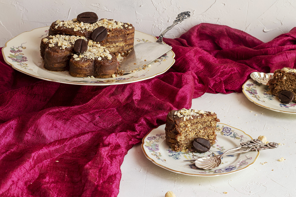 Кремът ми е с лешников тахан вместо масло и разбита на пяна aquafaba (вода от варене на бобови култури, обикновено нахут) вместо жълтъци. Консистенцията се получи изненадващо добра, макар и доста гъста. Имах едно наум, понеже замените са радикални, но успях да изненадам себе си много приятно. Именно гъстотата/твърдостта на крема е основната разлика с оригинала. Там се използва масло и кремът много бързо омеква на стайна температура. Лешниковият тахан не се държи така, но тортата е много хубава, ароматите на кафе и лешници си хармонират прекрасно.