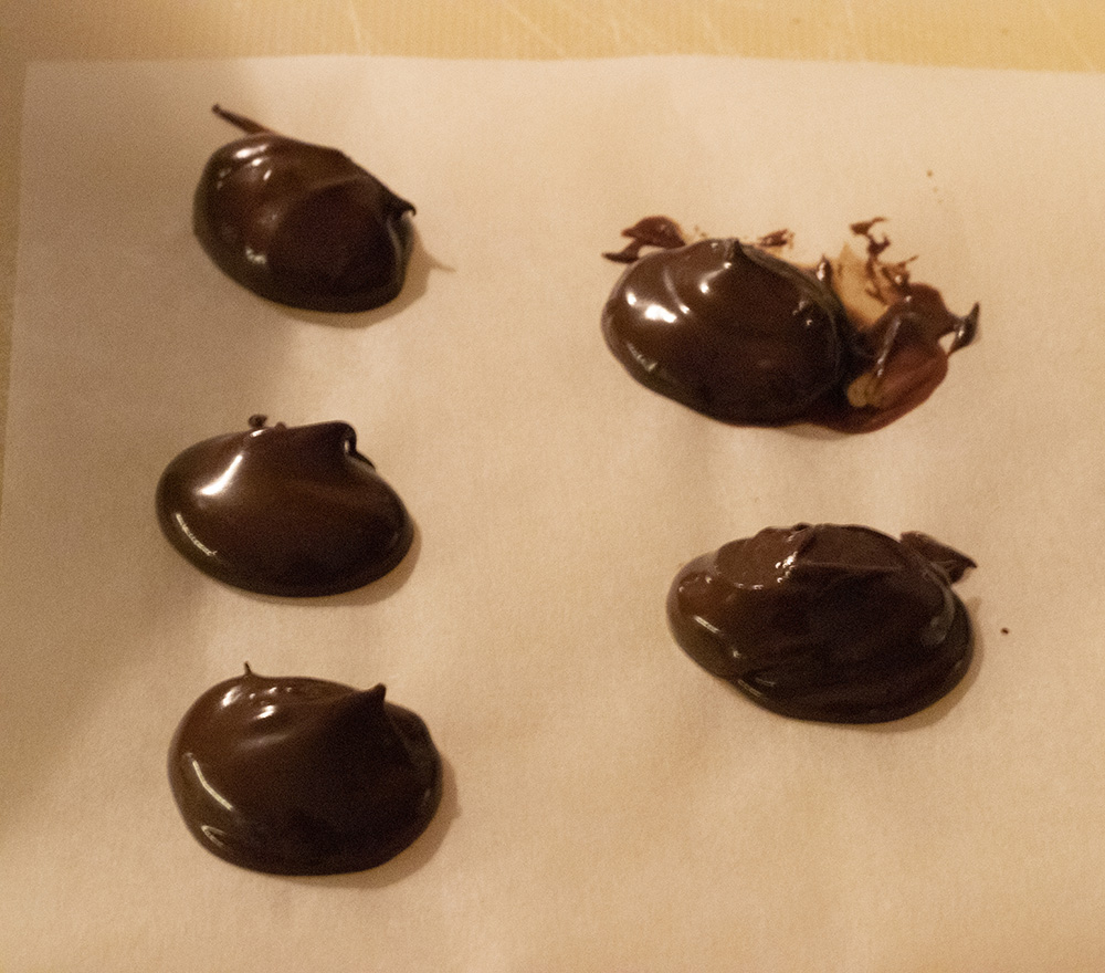 Понеже не съм кафе маниак и нямам кафе на зърна, реших да направя няколко гигантски „кафеени“ зърна от шоколад за допълнителна декорация. Разтопих 40 грама тъмен шоколад със стевия. Оформих 5 овала (вижте снимката) и ги сложиш във фризера за около час. След това много бързо (защото шоколадът омеква при допир) загладих овалната страна и направих нарез откъм плоската, за да имитирам зърното кафе.