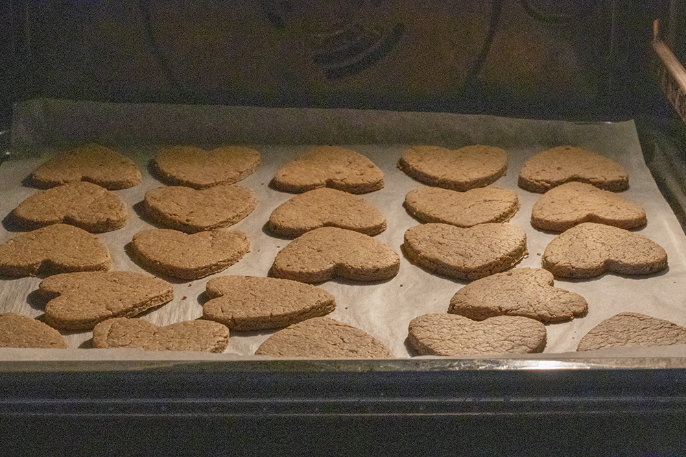От това количество тесто аз изрязах 23 бисквити-сърца с размер 7 на 7.5 см.