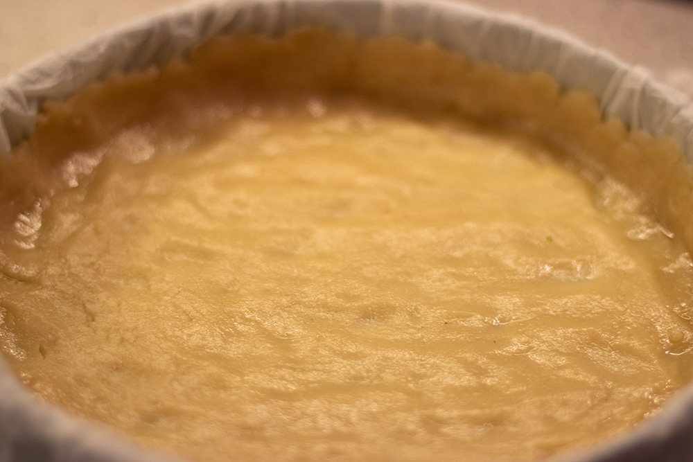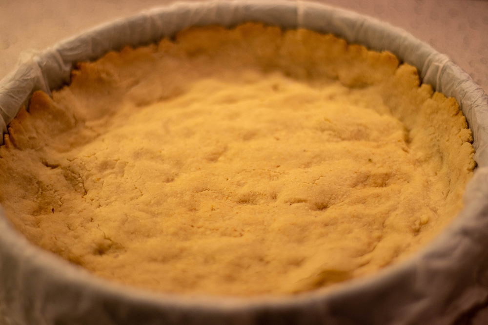 В блендер смесете нишестето, кокосовото брашно и солта и разбъркайте добре. Добавете шарлана и кленовия сироп и бъркайте докато се оформи силно ронливо (на практика на трохи) тесто. Пригответе форма със свалящи се стени с диаметър 23 м, като я постелете с навлажнена домакинска хартия (за да приеме лесно формата на съда) и намажете хартията с мазнина. Изсипете тестото от блендера и с пръсти притиснете към дъното и стените, оформяйки борд.
