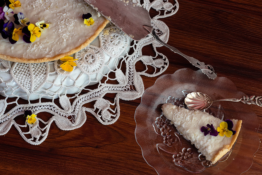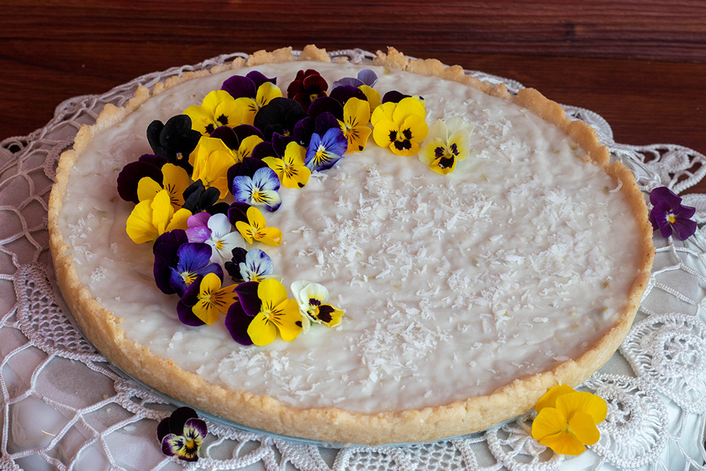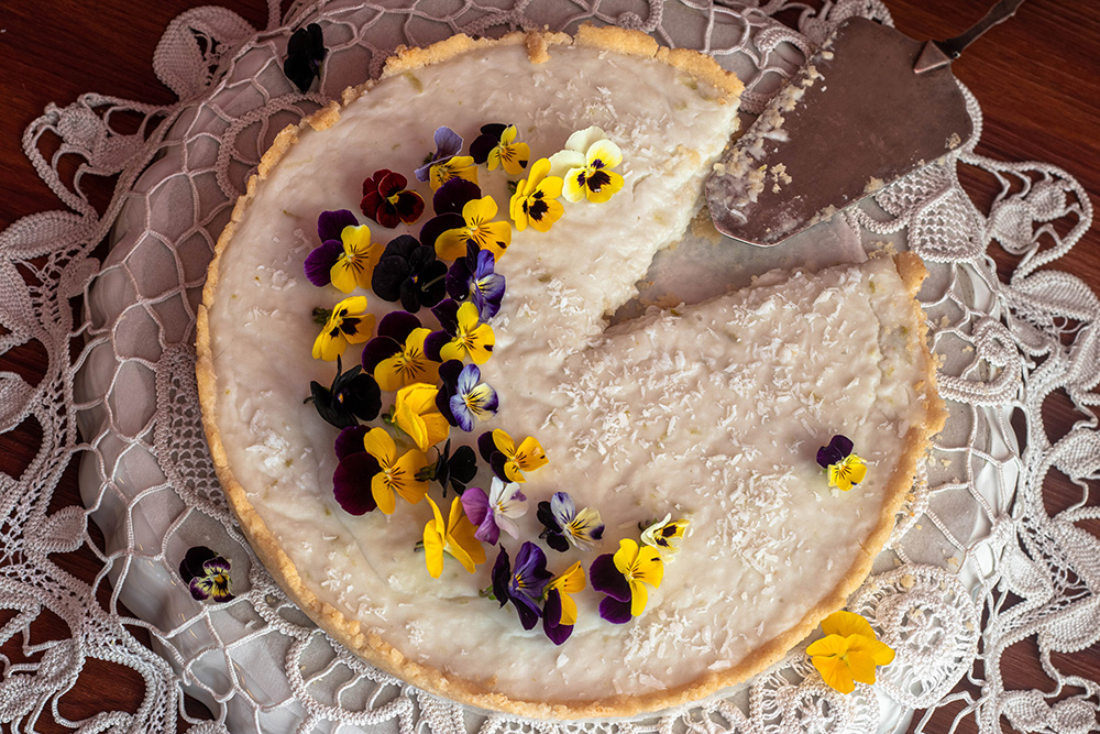 Върнете формата във фурната и печете на 175 градуса около 15 минути. Извадете от фурната и, след като се охлади малко, приберете в хладилника за няколко часа преди сервиране. Декорирайте с кокосови стърготини, кора от лайм или (както направих аз) с ядливи цветя. Те не променят нито допринасят с нещо за вкуса, но пък правят тарта много красив.