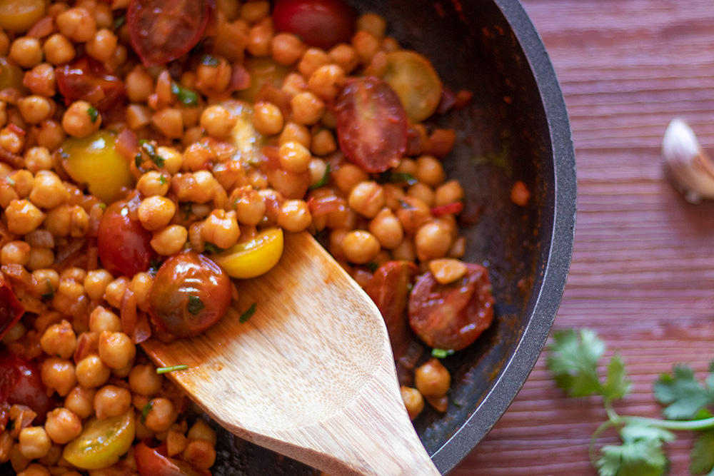 Загрейте зехтина в тиган с тежко дъно на средна степен (6 от 9). Добавете ситно нарязания лук и чесън и задужете за 2 – 3 минути. Добавете нахута, доматеното пюре и водата и разбъркайте добре. Подправете с червен пипер, сол и черен пипер и гответе около 5 минути. Добавете чери доматите и половината кориандър и оставете на котлона още няколко минути, докато сосът леко се сгъсти.
