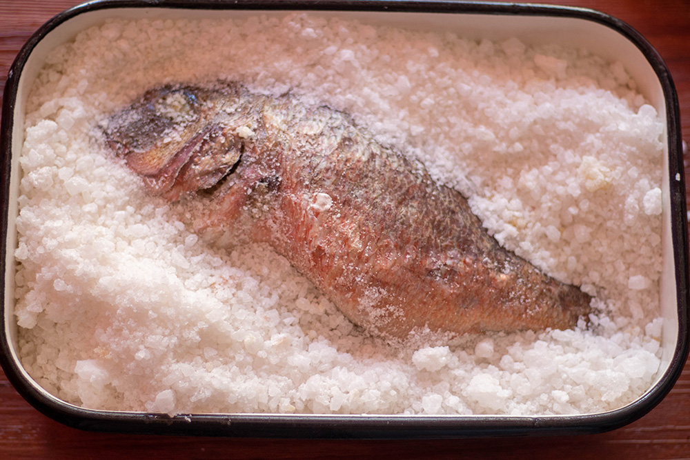 Oсвен прекрасния вкус, печената в сол риба има и няколко огромни (от практична гледна точка) преимущества: 1. солта я запечатва и затова къщата ви няма да мирише на риба, докато я печете и 2. почистването на тавата е изключително лесно – просто изсипвате костите, кожата и солта и измивате без търкане.