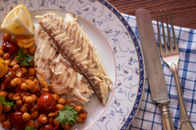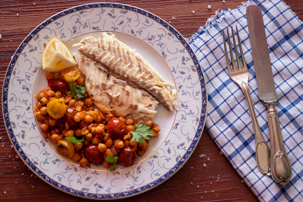Гарнитурата е нещо като яхния с нахут. Ако обичате пикантна храна, може да замените червения пипер с лют, но според мен в случая кимионът е достатъчен. Ако „главният герой“ беше телешко или свинско месо, аз първа щях да предложа лют червен пипер. Рибата обаче има по-фин, лек вкус, който лично аз не мога да свържа с люто.