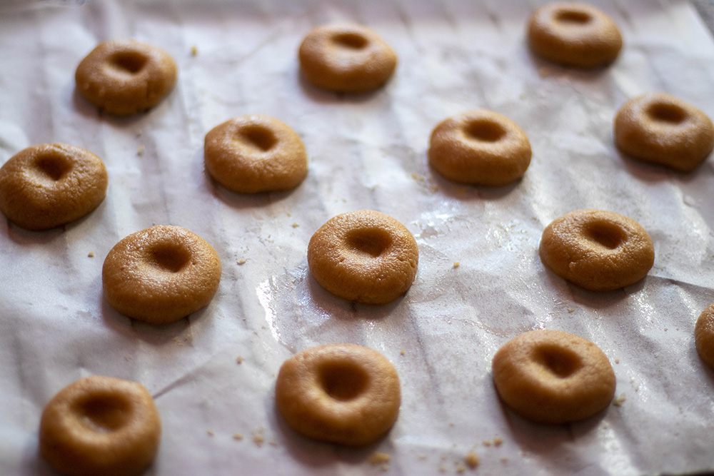 Загрейте фурната до 180 градуса. Оформете 18 топчета и ги разположете на разстояние едно от друго върху намаслена или постлана с хартия за печене тава. Сплескайте с пръсти и оформете вдлъбнатина в средата.