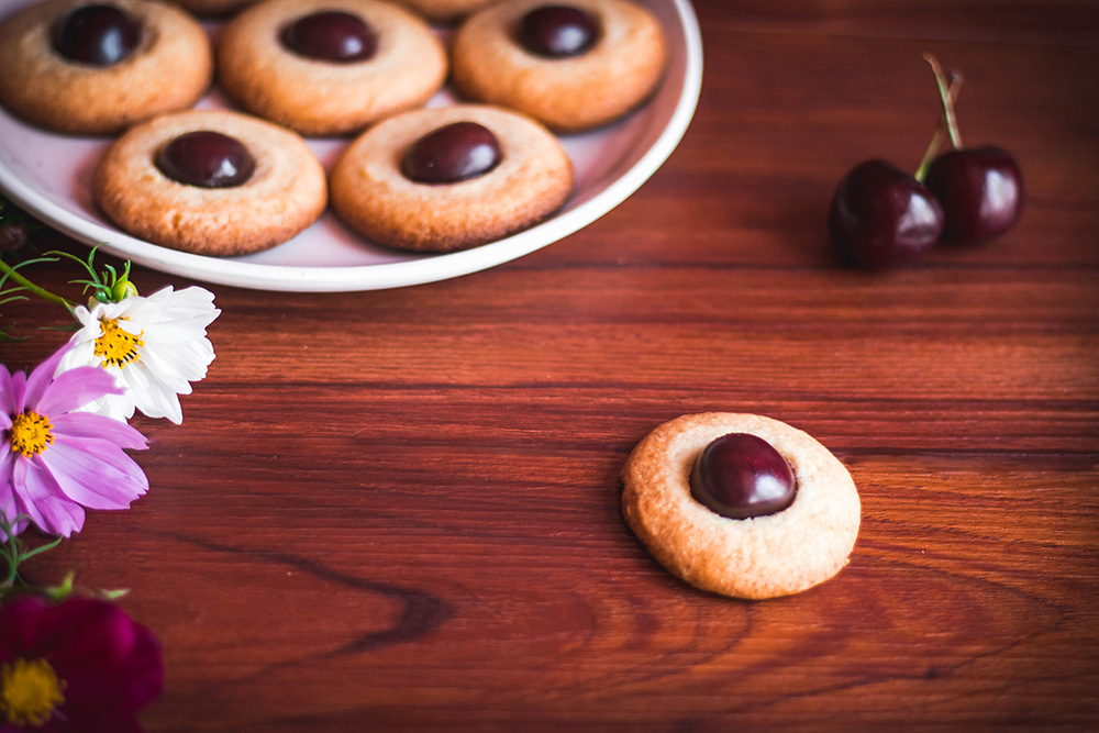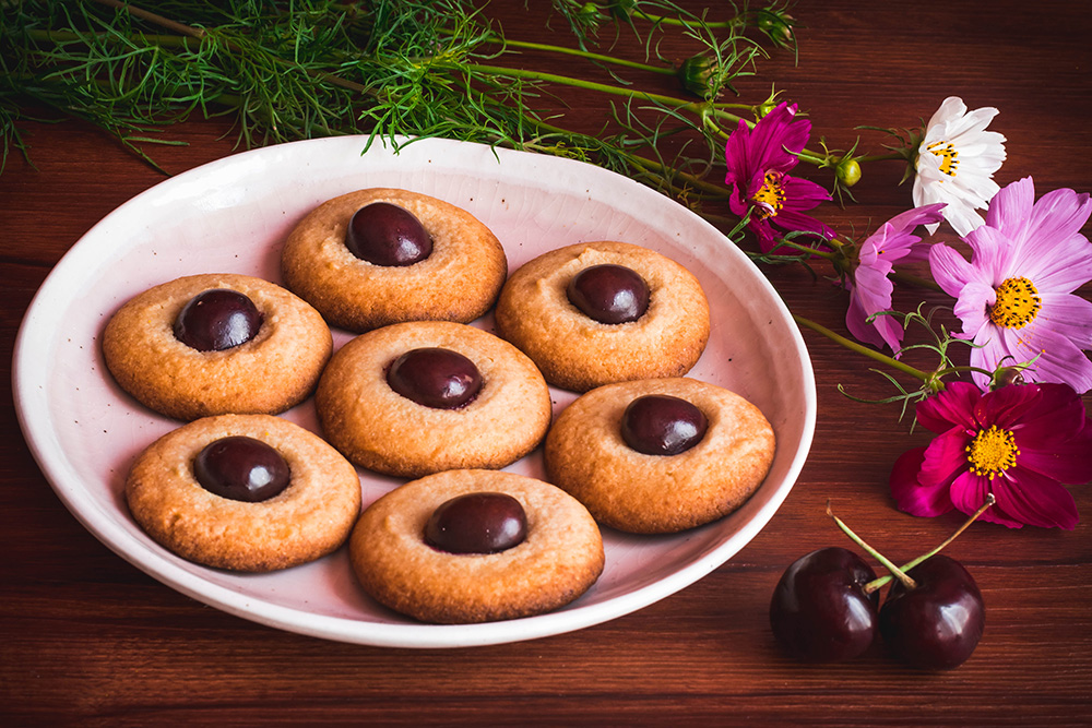 Сложете във фурната на ниво под средното и печете 10 минути. През това време измийте черешите, срежете ги на половина и отстранете костилките. На 10тата минута от печенето отворете фурната и сложете по една половинка с разреза надолу в средата на сладките. Затворете и печете още 5 минути.
