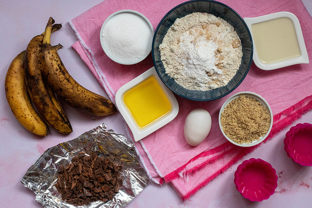 Сега е времето на летните плодове, затова, предполагам, не е изненада, че се оказах с едни доста узрели банани, които, ако не се употребят, ще трябва да изхвърля. И, за да не се стига до там, реших да опитам да преработя успешната рецепта за шоколадови мъфини в рецепта за бананови.