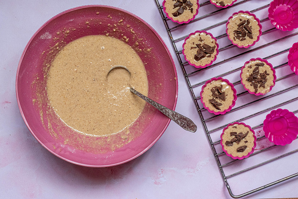 Изсипете сместа в добре намазнени форми за мъфини – излязоха 15 с диаметър 6 см. Върху всеки мъфин сложете няколко парченца шоколад.