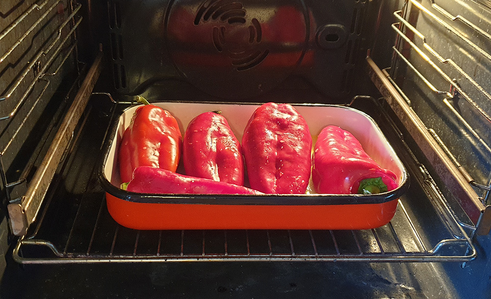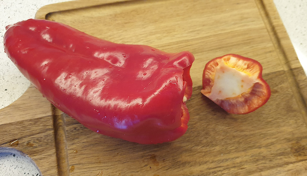8 средни червени чушки (по 2 в порция). За съжаление в магазина имаше само гиганти, и в този случай чушките са 5 – три оргромни, една голяма и една нормална.