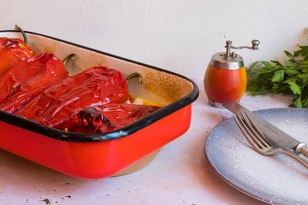 Това е едно от любимите ми летни ястия, защото е леко, вкусно, ароматно и може да се яде както топло, така и студено. Нямам много детски спомени, свързани с храна, но тези чушки и палачинките са едни от тях. Рецептата, която правя сега, е доста различна, но това не прави спомена по-малко мил.