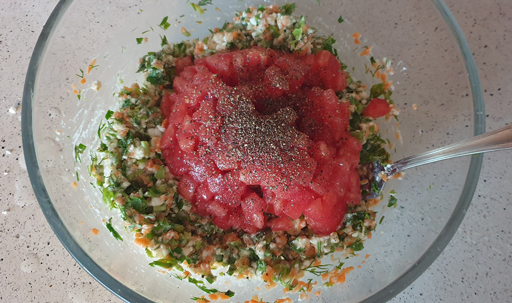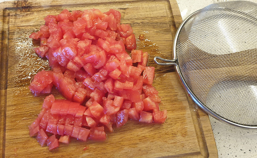 Аз лично започвам от доматите. Загрейте вода в малък съд и когато заври изключете котлона. Сложете домата в горещата вода за около 10 секунди, извадете и обелете. Срежете на 6 или 8 парчета и внимателно отстранете семките, така че да остане само месестата част. След това нарежете на ситни кубчета, сложете в сито/цедка и оставете да се отцедят. Целта е пълнежът да не стане воднист.