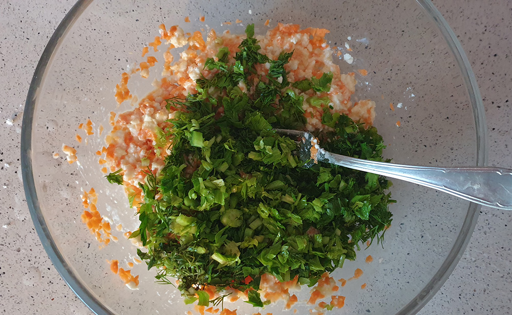 Нарежете морковите на дребно и ги наситнете в блендер. Или, ако предпочитате, ги настържете. Накълцайте подправките на ситно.