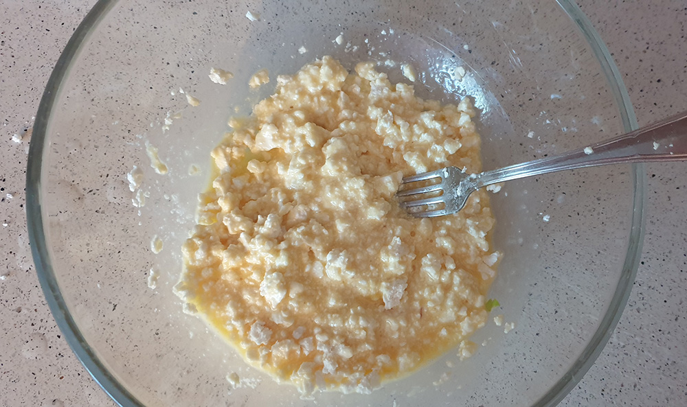 В достатъчно голяма купа разбийте яйцата с вилица. Добавете натрошеното сирене и разбъркайте.