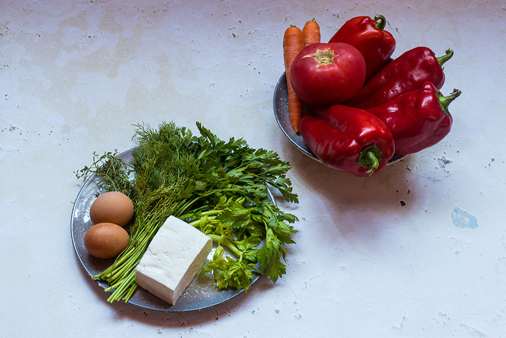 Винаги съм предпочитала червените чушки. Някак по-сочни и сладки са, независимо дали ще ги ползвам сурови, или ще минават термообработка. И този случай не прави изключение. Освен яйцата и козето сирене слагам морков, домат (само месестата част) и мноооого подправки.