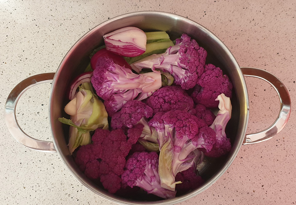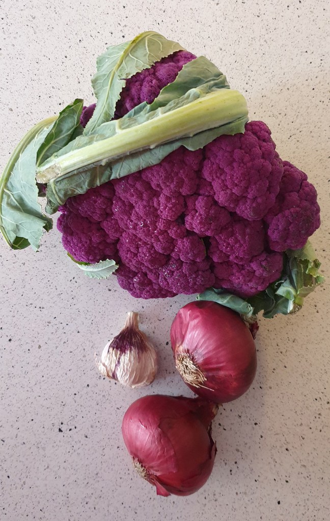 Много отдавна не бях правила супа. Дори любимата ми пилешка беше леко пренебрегната през летните месеци, за сметка на риба и салати. При последото пазаруване обаче един лилав карфиол ми намигна закачливо и нямаше как да не го купя. Не бях съвсем наясно какво ще го правя, но беше много хубав. Два дни по-късно съдбата му беше определена – ще става на крем супа.
