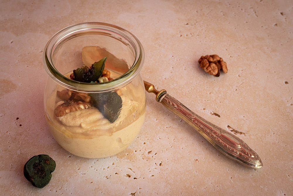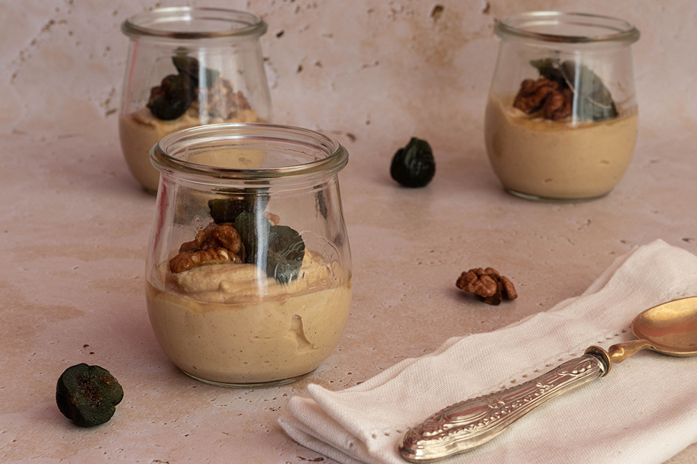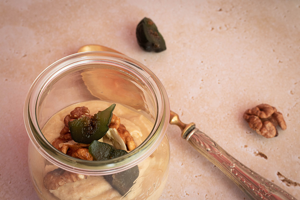 Нямаше как да оставя тази грешка непоправена и при първа възможност запретнах ръкави. Разбира се, чесънът, солта, черният пипер и кимионът отпаднаха от рецептата. Освен това замених традиционния сусамов тахан с лешников, чийто вкус обожавам. За подслаждане изневерих на еритритола и сложих манов мед, отново заради вкуса. Нищо не пречи да замените с еритритол на пудра (за да не хрупа), ако искате по-ниско калоричен вариант. Гарнирах с леко запечени орехи и сладко от зелени смокини. След охлаждане се получи фантастичен десерт. Може да ви звучи странно, но опитайте – няма да съжалявате.