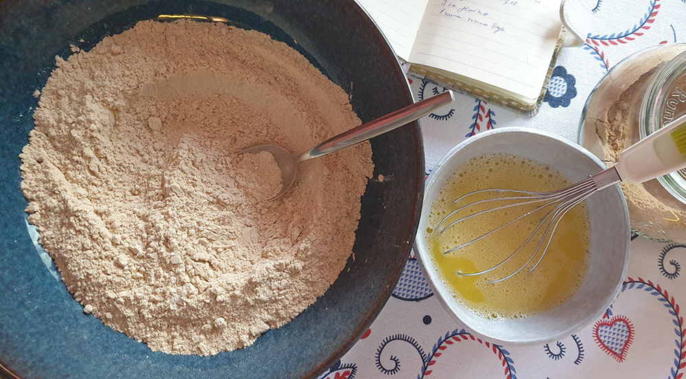 Пресейте брашната в достатъчно голяма купа. Добавете содата, гума ксантан, солта и сухите подправки и разбъркайте. В друга купа разбийте яйцето с оцета и зехтина.