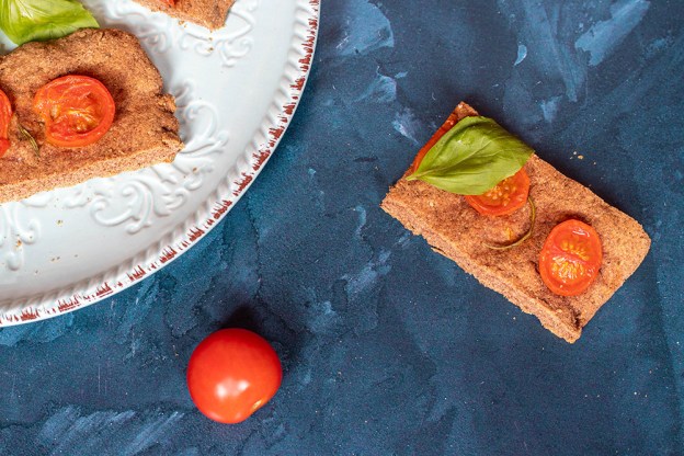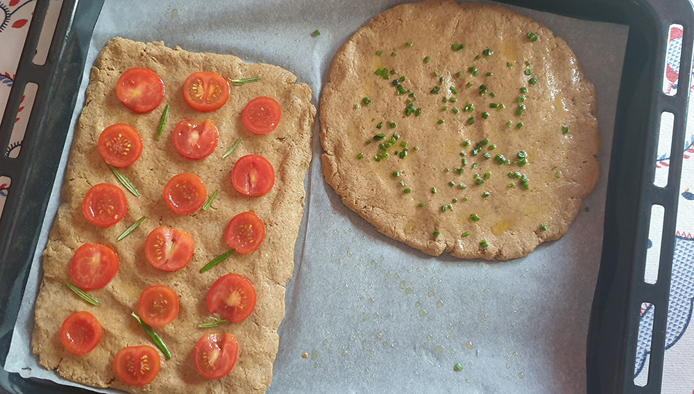 Пренесете тестото върху тавата и с пръсти офомете плоска питка (или питки – аз направих две). Понеже няма глутен и мая, тестото не е еластично. Формата зависи изцяло от вас. Намажете леко със зехтин. Сега е момента да гарнирате фокачата, с какво сте си избрали. Аз сложих чери домати и пресен розмарин на едната и ситно нарязан див лук на другата.