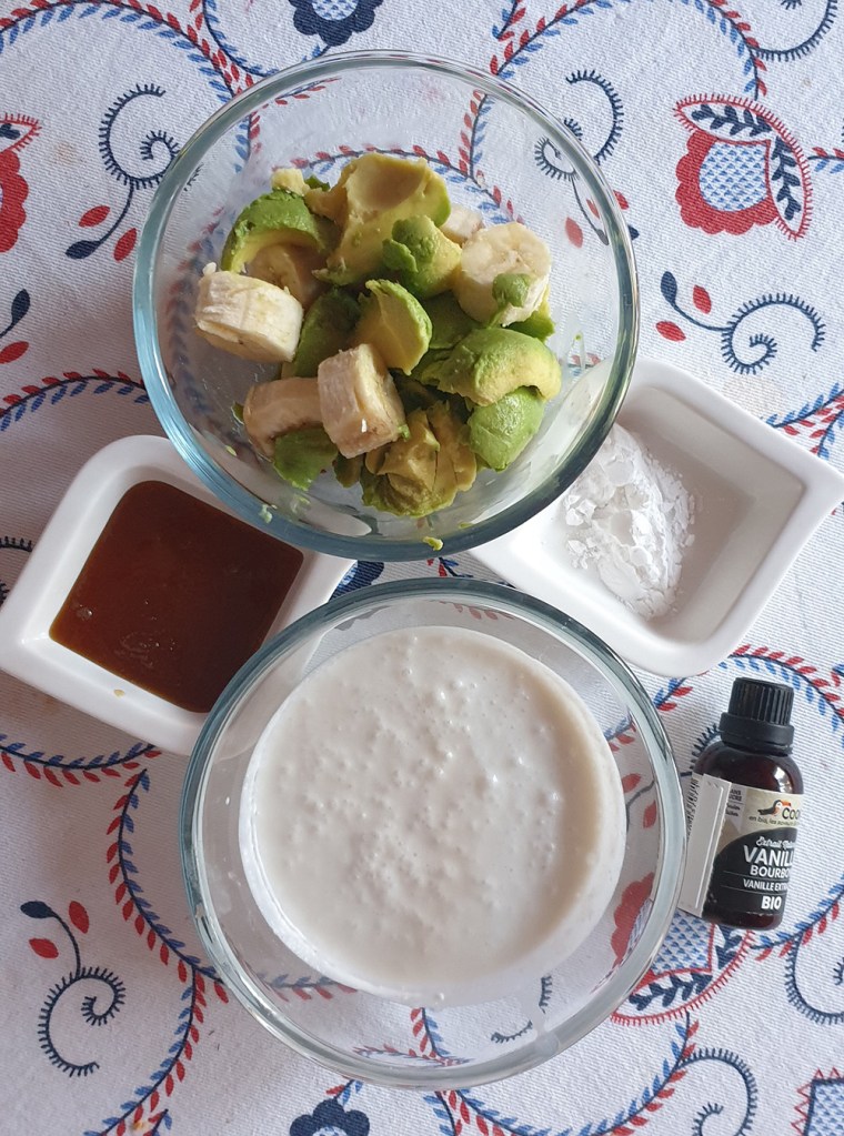 През това време сложете банана, авокадото, меда и ванилията в блендер и пюрирайте до гладка смес. Когато кокосовото мляко се е охладило, прехвърлете сместа от банан и авокадо при него и разбъркайте добре до пълно смесване. Приберете в хладилника за половин до един час. Пригответе съда, в който ще замразявате сладоледа и го сложете във фризера за десетина минути, за да е студен.