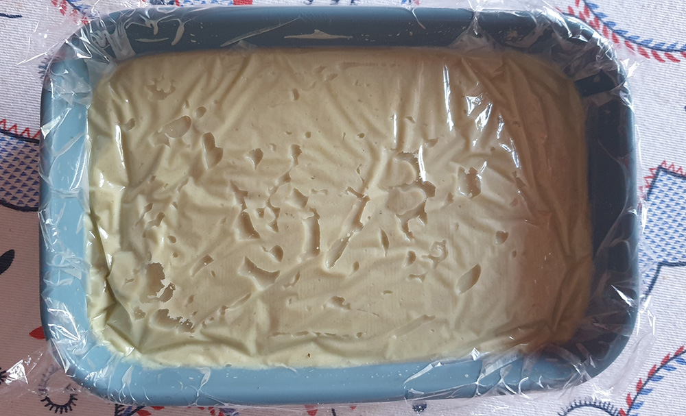 Покрийте с фолио и сложете във фризера. Фолиото пречи на сладоледа да образува „кора“.