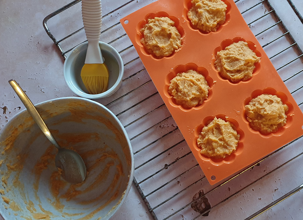 Загрейте фурната на 180 градуса. Разпределете сместа в силиконови форми за мъфини (при мен излязоха 7 големи). Печете 10 минути, след това намалете на 160 градуса и печете още 20 минути.