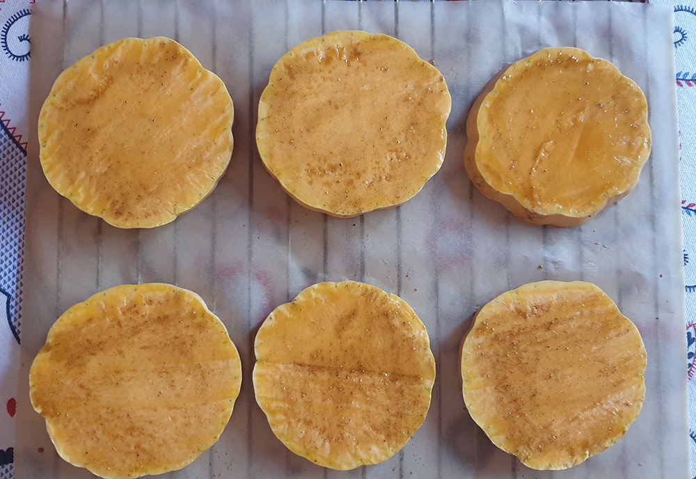 Загрейте фурната на 180 градуса. Нарежете тиквата на шайби с около 1 – 1.5 см дебелина – най-подходяща е частта откъм дръжката, където няма семки. Наредете шайбите в тава. В малка купичка разбъркайте добре зехтина и подправките и намажете тиквата от едната страна.
