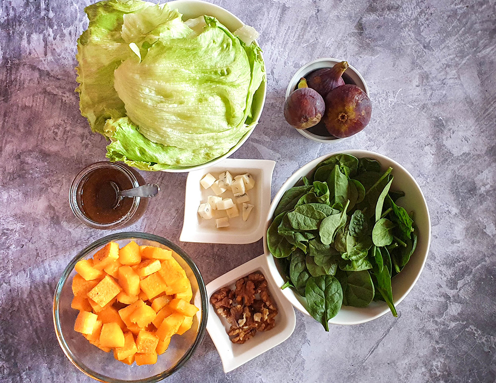 Измийте и подсушете спанака и салатата. Нарежете или натрошете горгонзолата. Нарежете орехите (най-добре е да са предварително запечени леко, но може да ги оставите сурови. В три подходящи чинии разпределете салатата и спанака. След това разпределете тиквата и смокините и гарнирайте с орехи и сирене. Последно добавете соса и сервирайте.